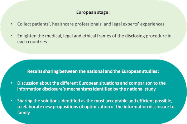 At the end of the study, we will share our results to all European countries in order to elaborate solutions to improve the efficiency and the acceptability of the genetic information disclosure procedure. By sharing the results, we hope that European solutions will bring new perspectives of optimization of the disclosing procedure in France, and reciprocally European patients associations will benefit from the findings of the national French study.